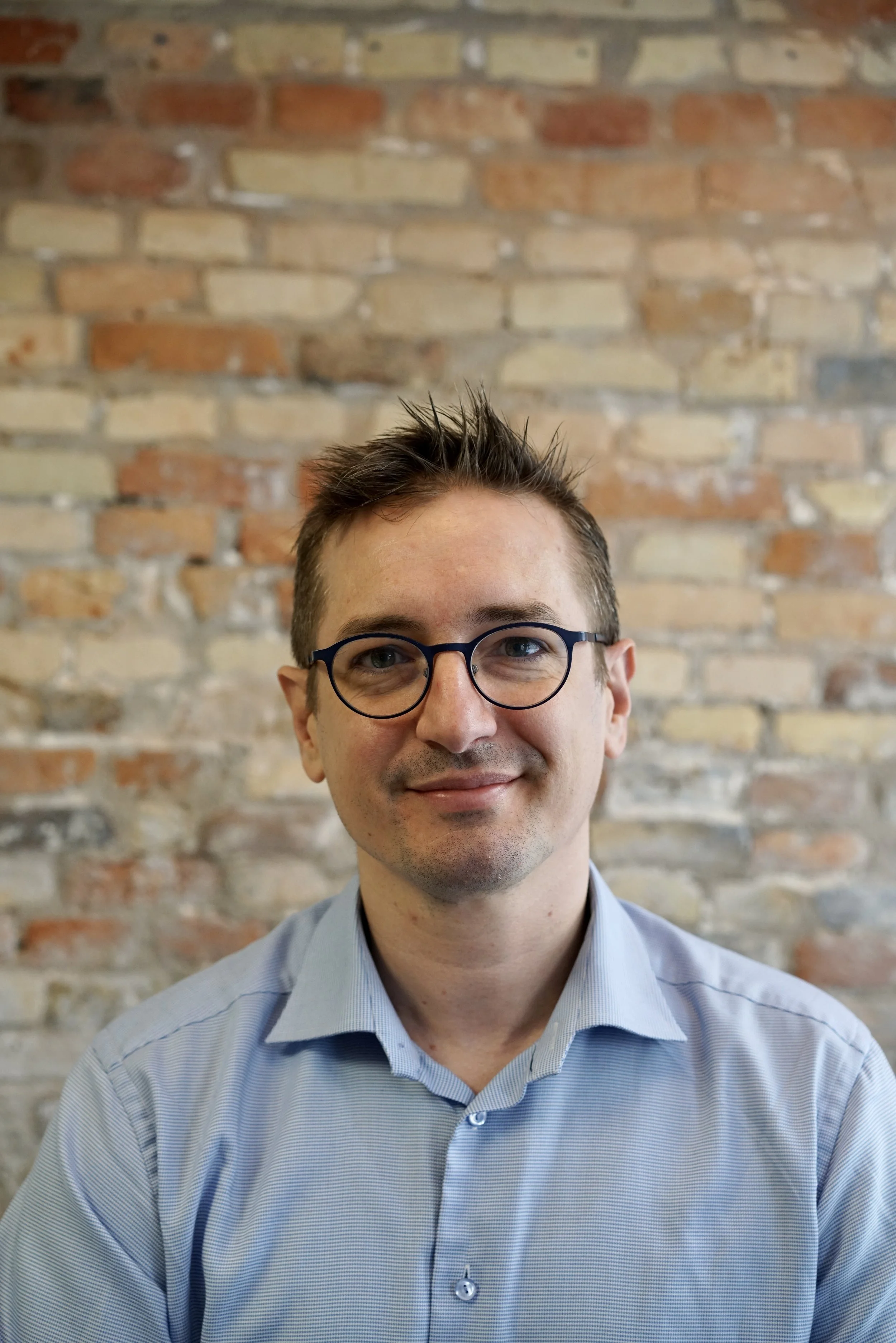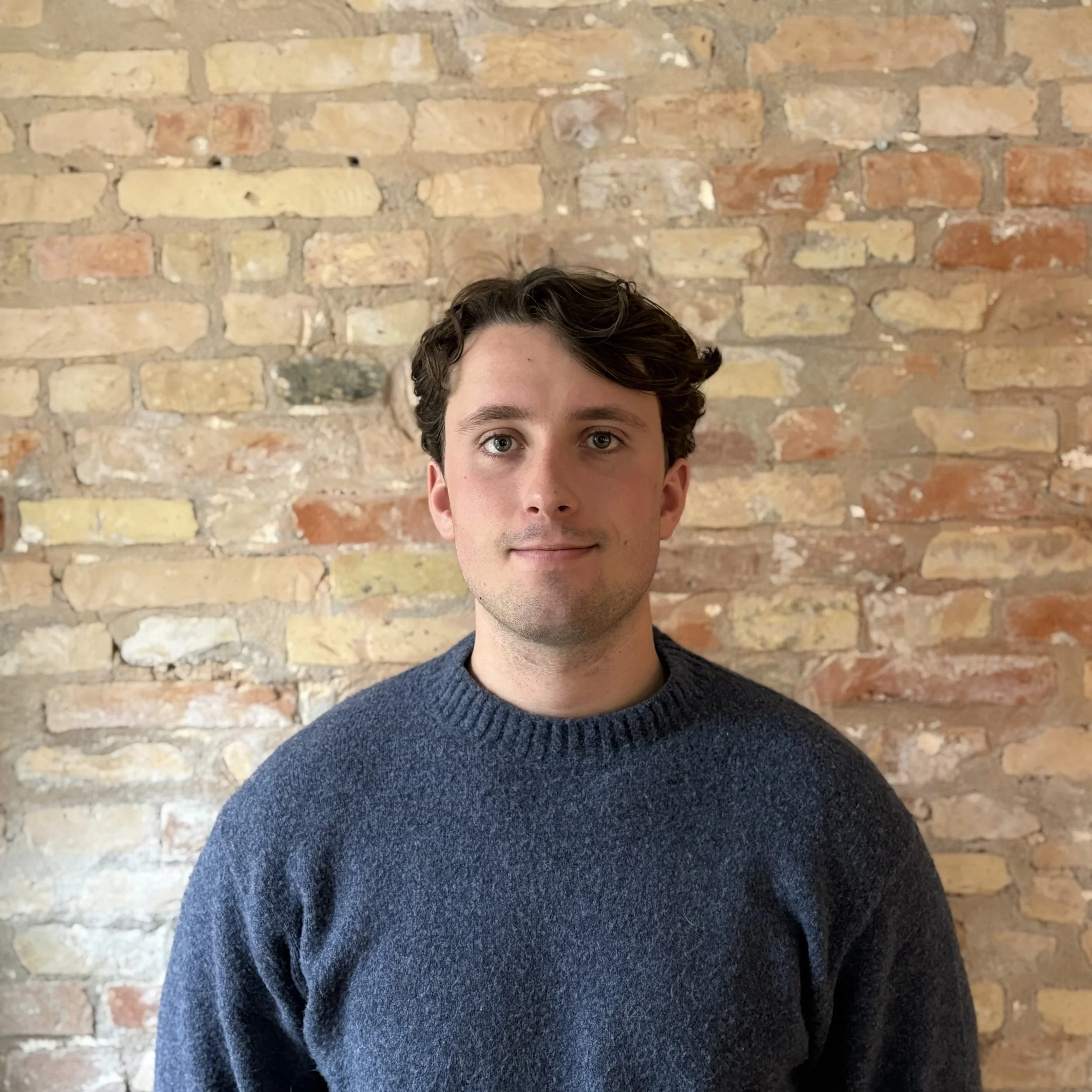 • A man with short brown hair, wearing a light blue collared shirt and a navy sweater, smiling in a room with white walls and framed pictures.