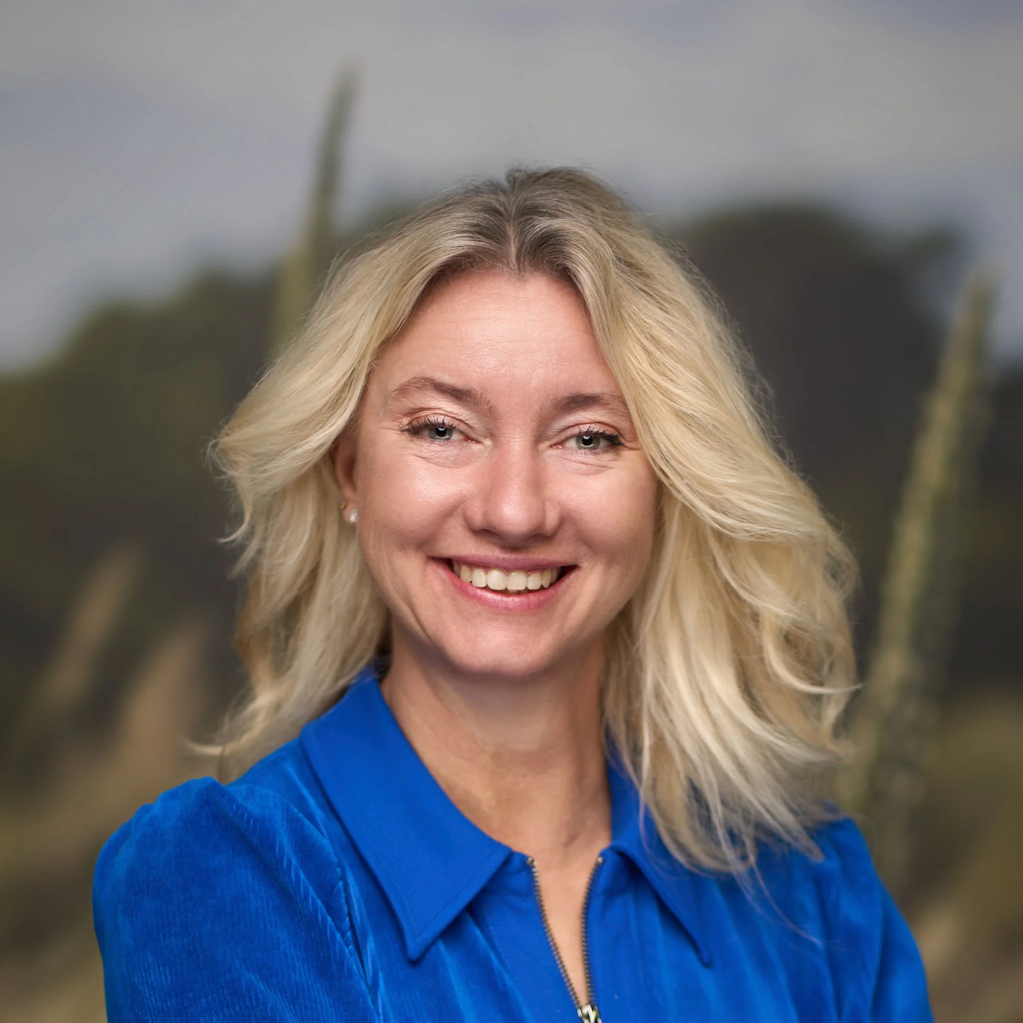 • Smiling woman with blonde hair, wearing a light blue blouse, facing forward against a plain background.