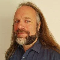 • A middle-aged man with short hair and a beard, wearing a suit and tie, standing against a gray background.
